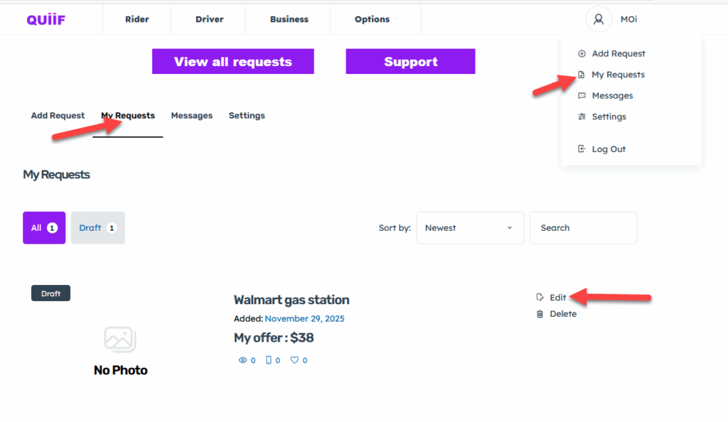 Hover over your profile image icon on the top right hand side and click on My Requests. Or just click on My Requests Request on the second menu
