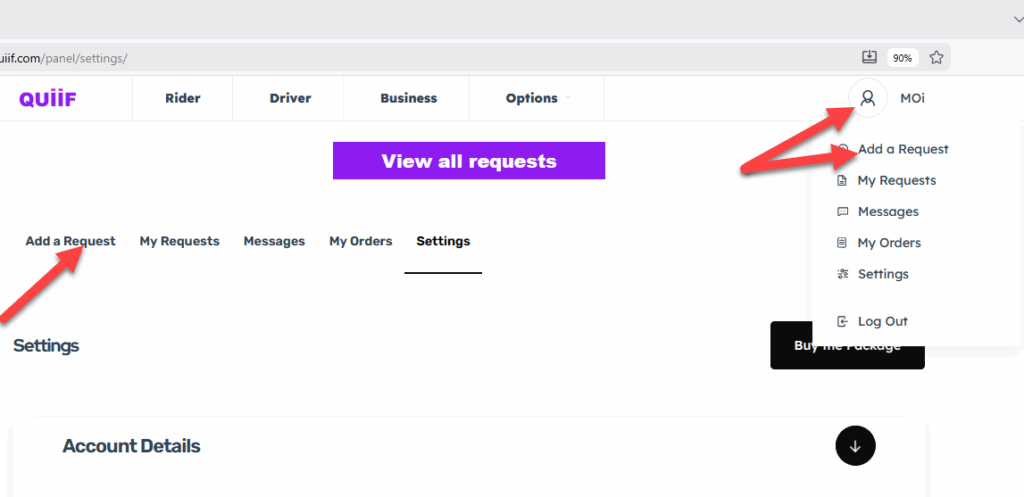 Hover over your profile image icon on the top right hand side and click on Add a Request. Or just click on Add a Request on the second menu