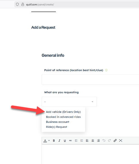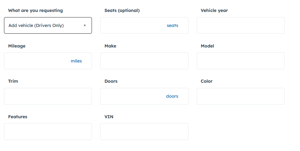In the What are you requesting dropdown select “Add Vehicle (driver(s) only“