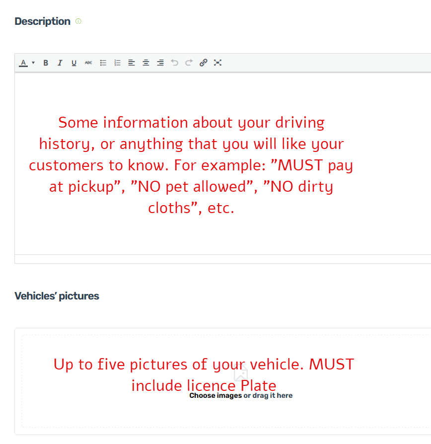 In the Vehicles’ Pictures, upload up to 6 pictures of your vehicle. They MUST include your license plate number