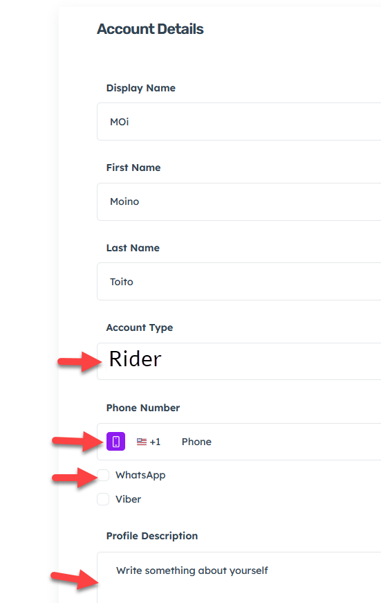 In the Account Details section, fill out your information including your cellphone number, your address, and check on WhatsApp and Viber. You could finish, if you like, with a brief description about yourself for your customers.